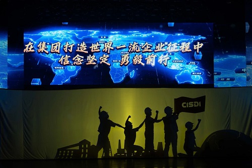 通过挖掘机、全战机、塔吊、钻地机、锤子等系列工具的运用,以及测量尺寸、旁站监理、奋勇出海等画面的展现,全面展示了钢厂一步步搭建的全过程,结合屏幕上的视频,不仅生动展现了赛迪工程咨询人在海外项目中的奋斗历程,更传递了公司对于国际化发展的坚定信念与不懈追求。