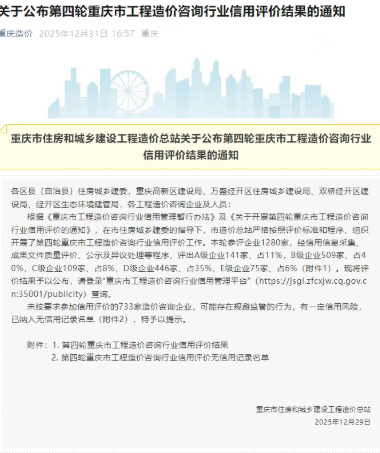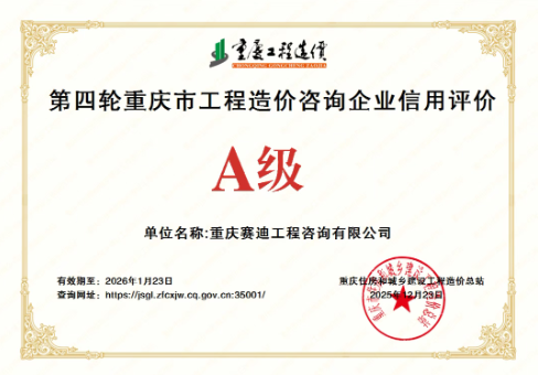 2025年12月底,重庆市住房和城乡建设工程造价总站正式发布第四轮重庆市工程造价咨询企业信用评价结果,赛迪工程咨询凭借综合表现再获重庆市工程造价咨询行业最高信用等级A级。本次蝉联A级充分展示了赛迪工程咨询在工程造价咨询领域的强劲的综合实力、良好的行业信誉和行业影响力。
