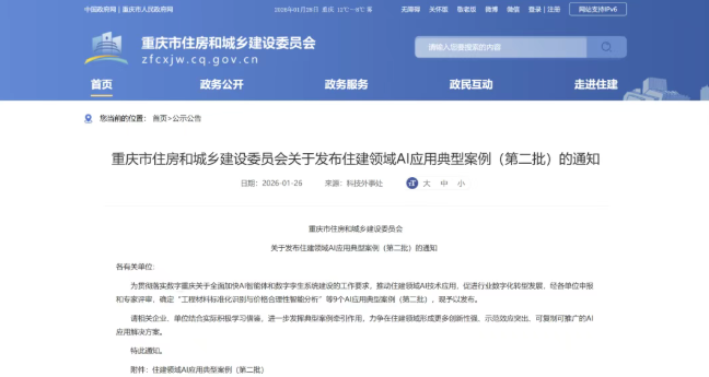 1月26日,重庆市住房和城乡建设委员会正式发布了《关于开展第二批住房城乡建设领域人工智能(AI)应用典型案例征集工作的通知》的评选结果。赛迪工程咨询自主研发的科研成果“施工现场多隐患同步智能判定”,凭借在工程安全管理数字化领域的科技创新与应用实效,从众多申报项目中脱颖而出,成功入选全市AI应用典型案例。