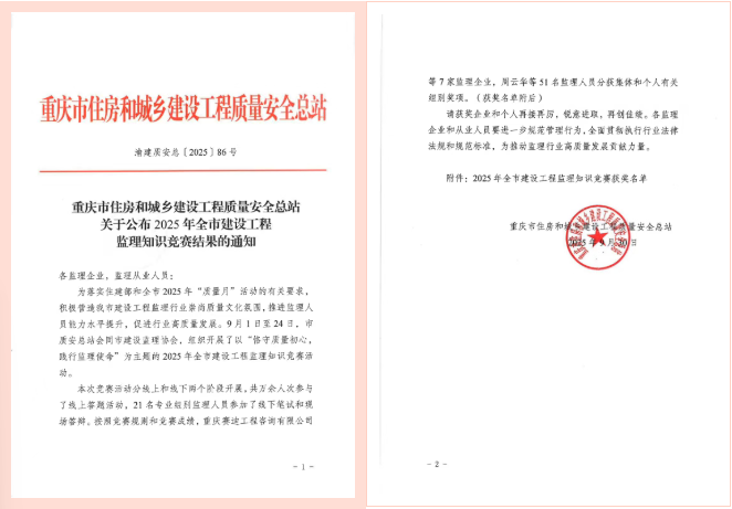近日,由重庆市住房和城乡建设工程质量安全总站主办、重庆市建设监理协会承办的2025年全市建设工程监理知识竞赛结果正式公布。重庆赛迪工程咨询有限公司凭借出色的组织动员能力与参赛选手的过硬专业素养,成为重庆市获奖企业之一,全市仅4家企业获得奖项。同时公司多名参赛员工在个人组别中脱颖而出,其中获总监理工程师组一等奖1名,专业监理人员组二等奖1名,充分彰显了公司在监理行业的专业实力与责任担当。