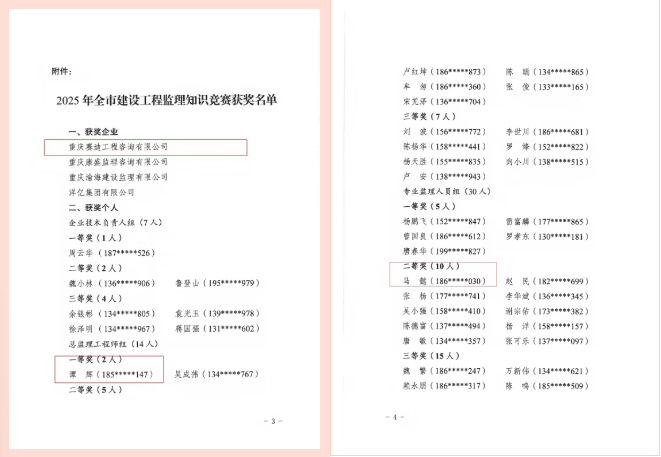 在9月11日-12日的线上初赛阶段,公司参赛选手严格遵守竞赛规则,凭借扎实的专业知识储备高效完成答题,最终以优异的线上答题平均分与较高的参赛人数占比,为公司赢得了综合评分优势,其中获奖人员谭辉、马懿由重庆市建设监理协会推荐至中国建设监理协会,将代表重庆赛区参加第二届全国监理知识竞赛。