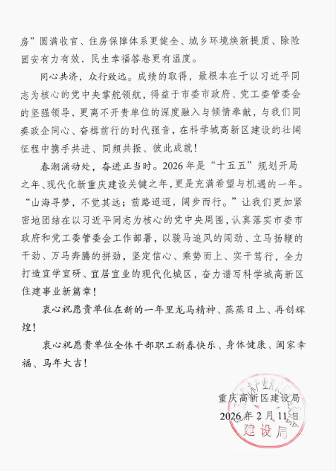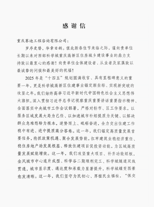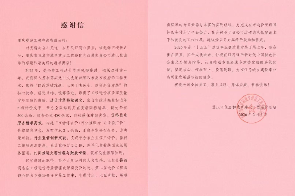 信中表示,2025年是全市工程造价管理“砥砺奋进、硕果盈枝”的一年。优异成绩的取得,离不开赛迪工程咨询的大力支持。公司展现出深厚的专业素养与丰富的实战经验,为全市造价管理目标任务完成提供了坚实支撑。2026年是“十五五”造价事业高质量发展开局之年,使命重在担当,实干成就未来。赛迪工程咨询将以此为激励,持续深化与行业主管部门的专业协同,将信任转化为标准,把口碑固化为能力,以更高质量的服务,为重庆市住房城乡建设事业谱写新的篇章。