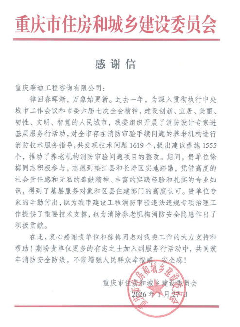 重庆市住房和城乡建设委员会日前向赛迪工程咨询发来感谢信,对施工图审查咨询事业部徐梅同志在全市养老机构消防设计专家进基层服务行活动中的突出表现予以高度肯定。2025年,徐梅主动请缨奔赴垫江县、长寿区实地踏勘,凭借扎实的专业功底和强烈的社会责任感,为解决养老机构消防审验手续难题提供有力技术支撑,赢得基层单位和区县住建部门一致认可,有力推动全市养老机构消防安全隐患治理及建设工程消防审验专项工作。