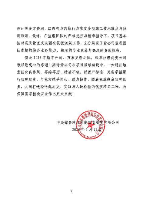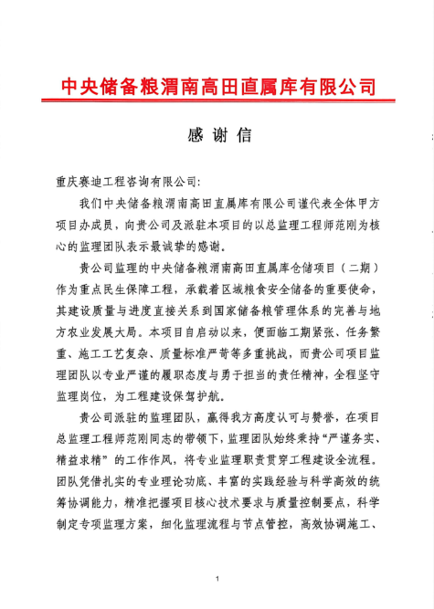 中央储备粮渭南高田直属库有限公司日前向赛迪工程咨询发来感谢信,对公司派驻的项目监理团队在仓储项目(二期)浅圆仓桩基、筏板施工监理过程中的责任担当予以高度肯定。该项目作为重点民生保障工程,承载着区域粮食安全储备重要使命,其建设质量与进度关系到国家储备粮管理体系的完善与地方农业发展大局。