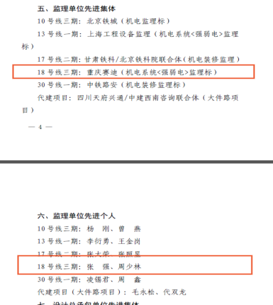 3月,赛迪工程咨询收到成都轨道建设管理有限公司发来的表彰通报,公司服务的成都地铁18号线三期工程机电系统(强弱电)监理项目荣获“专项劳动竞赛先进集体”称号,张强、周少林荣获“专项劳动竞赛先进个人”。