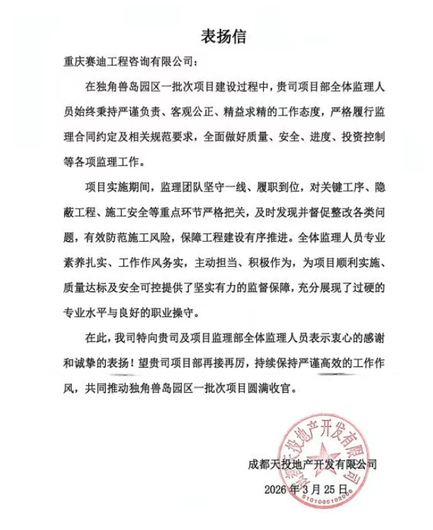 3月25日,重庆赛迪工程咨询有限公司收到成都天投房地产开发有限公司发来的感谢信,信中对赛迪工程咨询监理的独角兽岛园区一批次项目监理团队予以高度赞誉,充分肯定团队在项目建设中展现的专业能力、敬业精神与责任担当,对团队为项目顺利推进提供的坚实监理保障表示衷心感谢与诚挚表扬。