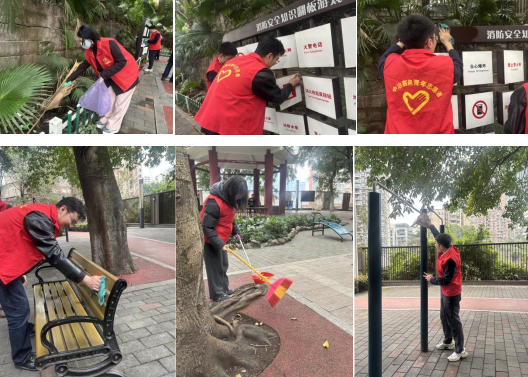 活动当天,志愿者们身穿红马甲,手持扫帚、垃圾夹、抹布等工具,分工协作、干劲十足。大家认真清理绿化带中的塑料袋、烟头、纸屑等积存垃圾,不放过任何一个卫生死角;仔细擦拭公园长椅和健身器材,让公共设施焕然一新;同时,全面清扫路面及角落的落叶杂物,使社区恢复整洁宜人的面貌。